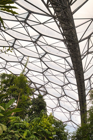 A view of a modern greenhouse structure with a geometric roof design, featuring a network of metal beams and transparent panels. Lush greenery is visible below, creating a vibrant indoor garden atmosphere.