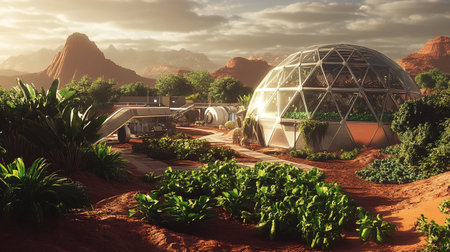 A futuristic greenhouse stands in a red, rocky Martian terrain illuminated by soft light. Surrounding the main dome are smaller habitats, hinting at life-supporting innovations for future exploration.