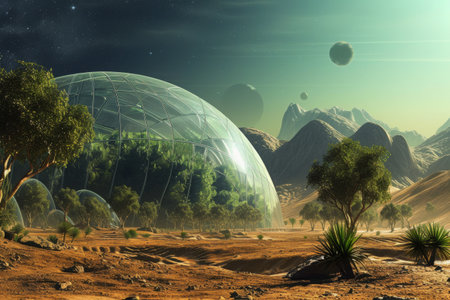 A stunning image of a futuristic landscape featuring towering mountains and lush trees, A panoramic view of a bio-dome on Mars housing a green forest, AI Generated