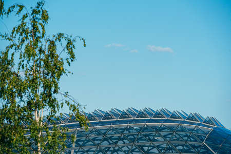 Predatory bristling dome roof in Zaryadye park. Landscape panorama with green birches in the foreground