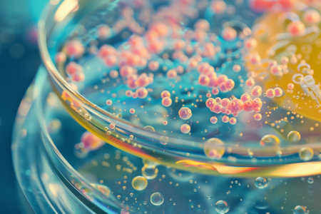 Macro close up shot of bacteria and virus cells in a scientific laboratory petri dish. Generative AI illustrator