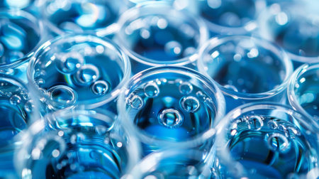 A visually striking image of clear plastic petri dishes arranged in a laboratory environment, enhanced by blue lighting that casts an intriguing glow, perfect for scientific and educational themes.