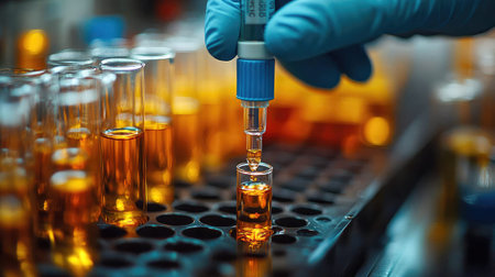 A scientist's gloved hand holds a vial with a glowing liquid, symbolizing groundbreaking advancements in biotechnology. the setting features state-of-the-art lab equipment, a high-tech atmosphere focused on scientific breakthroughs.