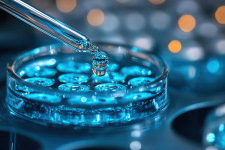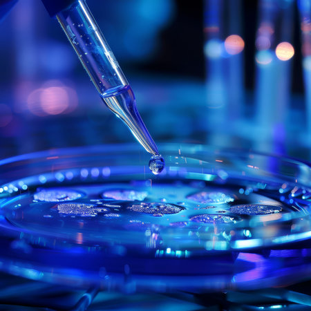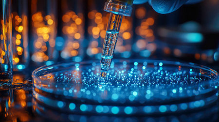 A pipette is carefully adding a droplet into a petri dish filled with a vibrant blue solution in a lab.