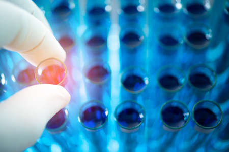 Close up woman hand in a rubber gloves put sample in a glass vial with blue cap into the autosampler rack in HPLC system. High performance liquid chromatography for separation compounds . Scientific and research work at chemical or clinical laboratory