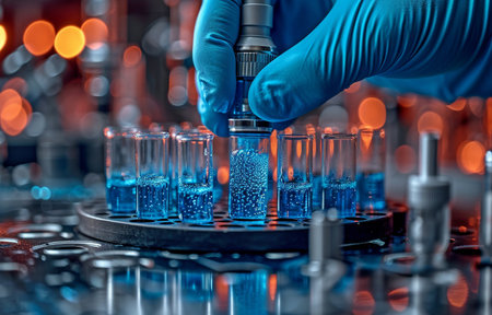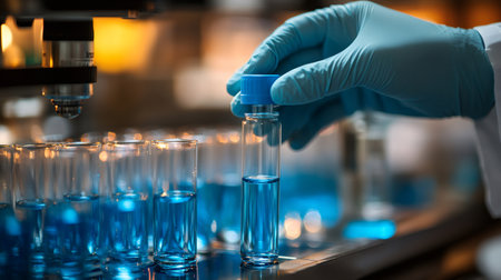 Gloved hand closing test tube with blue liquid in modern laboratory setting