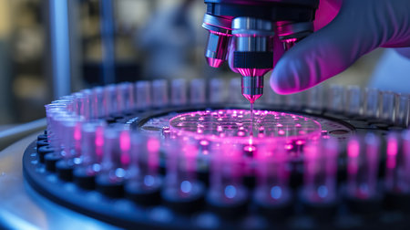 Laboratory equipment pipetting a glowing red liquid into a micro-well plate for scientific research or analysis.