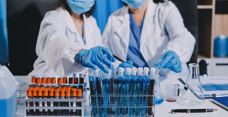 Laboratory assistants are investigating chemical reactions, medical scientists, chemical researchers, chemical experiments and disease testing from patient blood samples. Medicine and research concept