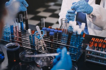 Close up of test tubes for science experiment. Doctor in white coat research a new experiment in laboratory, analyzing biotechnology work with modern equipment.