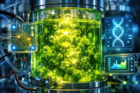 A bioreactor contains a bright green substance with bubbles. Digital screens show data on microorganisms and genetic patterns.