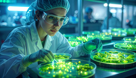 A focused scientist conducts research in a modern laboratory, handling petri dishes while digital biological data visualizes complex interactions, symbolizing health innovation.