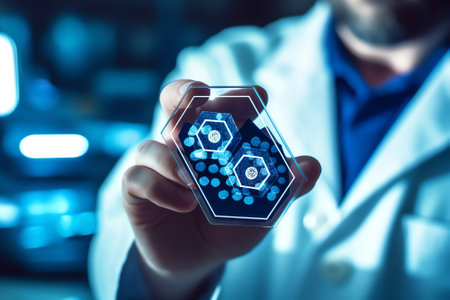 Scientist hand in blue glove holding microfluidic chip for inspection, biotechnology research concept, laboratory setting. Focus on scientist. Image created using generative AI.