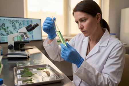Focused woman scientist in protective gloves holds a test tube with green fluid while studying plant leaves and roots on a tray near a microscope and computer screen in a bright research facility.