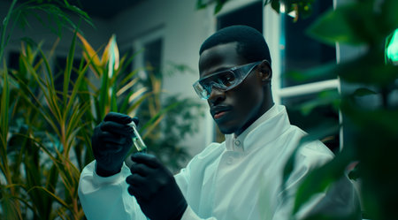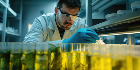 A scientist in gloves and goggles analyzes plant growth in a laboratory, holding vials with green samples, showcasing the intersection of biotechnology and environmental research.