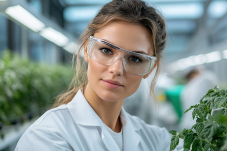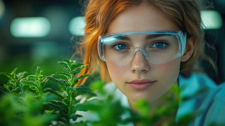 A female scientist wearing a lab coat and safety goggles, closely examining plants, symbolizing research in agriculture or botany.