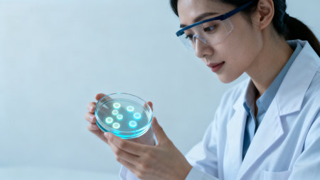Under the soft glow of blue lighting, a scientist in a lab coat focuses intently on a petri dish.