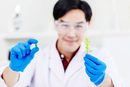 young biologist in glasses conducts chemical experiment with live plant sprouts