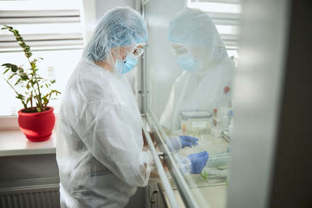 Young female scientist in lab coat and glasses working with plants in test tubes
