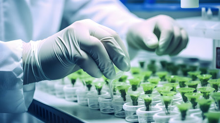 Biotechnology, Science of Genetic Engineering. Scientist experiments with genetically modified plants, laboratory, test tubes, plants obtained by new genomics techniques, mutagenesis. Generative ai.