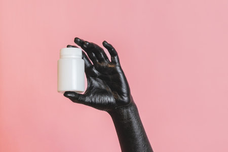 Black painted elegant woman's hand on her skin with a white cosmetic bottle. High Fashion art concept. Product cosmetic advertising