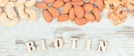 Vintage photo, Inscription biotin with various nuts and almonds as source vitamin B7, dietary fiber and natural minerals, concept of nutritious eating