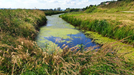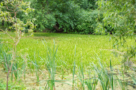 Reed bed and green duckweed tightly covering the water surface