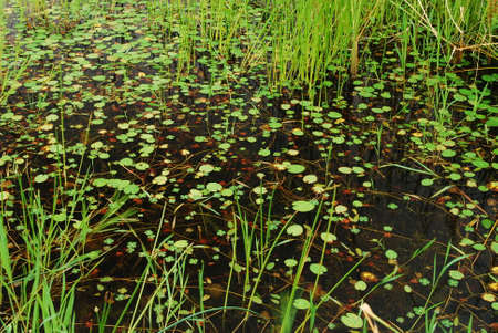 Vegetation in the vicinity of forest lake. Close up.