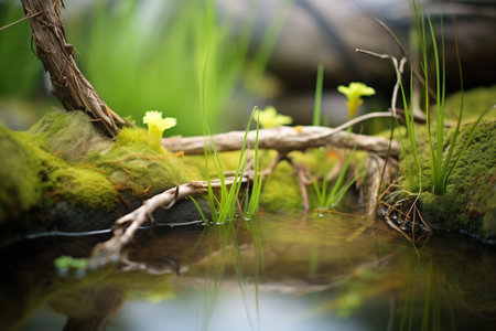 This photo captures a vibrant wetland scene showcasing textures of water, algae, and driftwood. The serene setting highlights the delicate balance of nature in an aquatic landscape.
