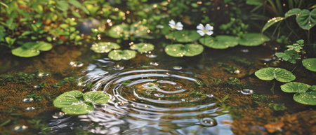 A tranquil pond with floating lily pads, surrounded by dense greenery, captured in soft natural sunlight, evoking a peaceful and serene atmosphere.
