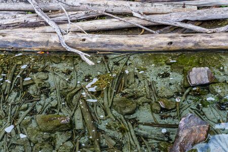 Driftwood is on top of water and below at Gene Coulon Park in Renton, Washington.