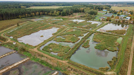 Aerial view of landfill for waste storage. Sewage farm.