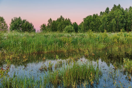 Mysteriously green pond with old stumps and snags in front of the forest at sunset