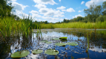A pond with a lot of grass and lily pads. The water is calm and clear. The sky is blue with some clouds