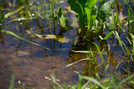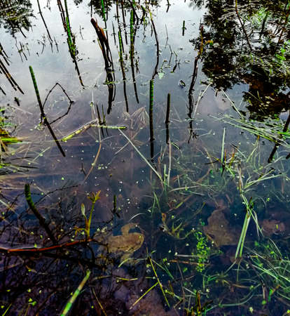 Crystal clear water. Green plants, leaves, grass. Abstract natural texture, background, graphic resources. Nature, environment theme. Tranquility, purity, meditation concepts
