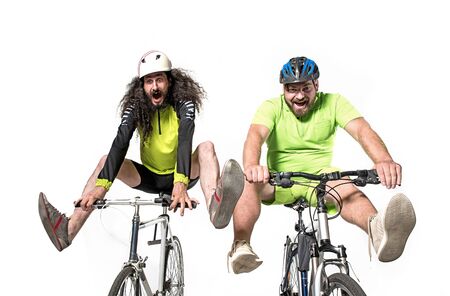 Businessmen ride bike. Partnership, team riding bicycle together. Teamwork business cooperation and leadership line vector concept. Illustration of cooperation leadership, together success teamwork