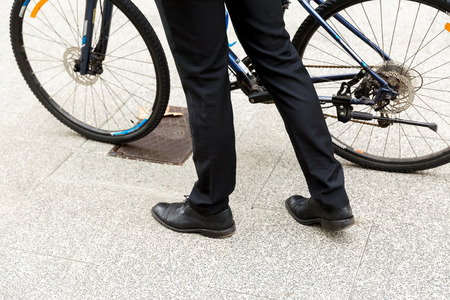 Travel, cycling and shoes of business woman in city for corporate, carbon neutral and commute. Health, eco friendly transportation and closeup of employee on bike for wellness, urban and bicycle