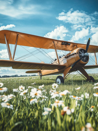 A vintage biplane stands peacefully in a grassy field, framed by blooming flowers and a vibrant blue sky on a sunny day.