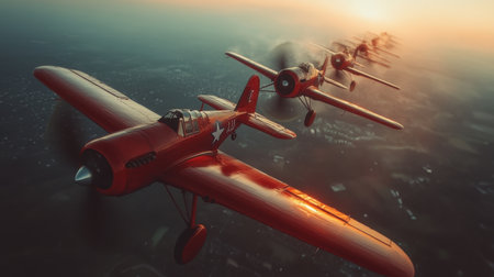A group of vintage red aircraft fly in formation during sunset casting a warm glow over the landscape below highlighting their swift movement.