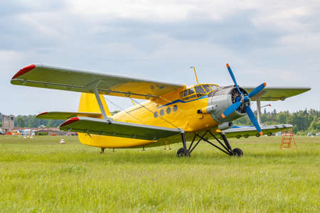 Yellow painted legendary soviet aircraft biplane Antonov AN-2 parked on a green grass of airfield against cloudy sky