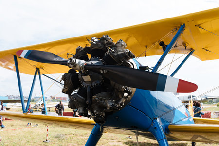 Vintage aircraft with radial engine and wooden propeller, close up of nose section, selective focus on engine
