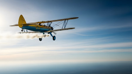 Vintage biplane flying over open farmland, sunny skies, nostalgic sepia tones Generative AI
