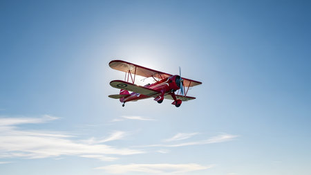 air-to-air shot of a vintage biplane in sunset light, created with generative ai