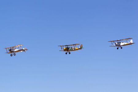 Avalon, Australia - March 3, 2013: Sopwith Pup (replica) VH-PSP operated by the Royal Australian Air Force (RAAF) Museum leading two de Havilland Tiger Moth aircraft in formation.