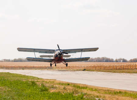 Frong view to biplane standing on airports with cloud sky