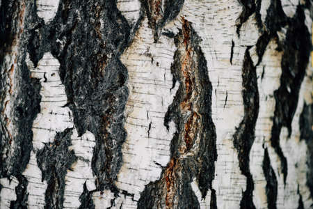 Bark of a birch tree backdrop close up, background from natural material, white crust with black stripes. Autumn forest.