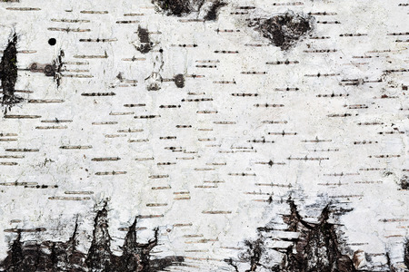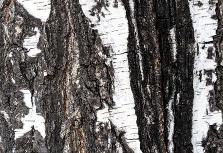 Natural wood background - birch bark: white trunk with black strips. Beautiful Russian Siberian tree.