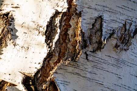 Abstract background with cracked birch bark against the background of sunlight. Birch bark close-up