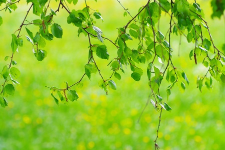 Birch branches with leaves lit by the sun. Green floral background.