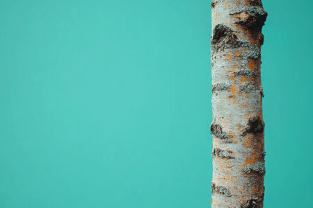Close-up view of birch tree trunk featuring white bark and dark knots, set against a bright turquoise background, highlighting natural beauty and texture