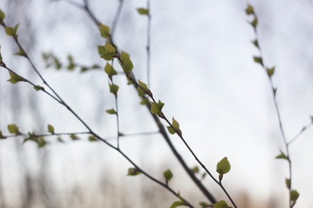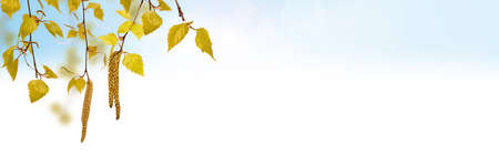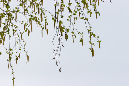 Branches of the silver birch with small young leaves and catkins hanging down on a blurred background of cloudy sky, selective focus